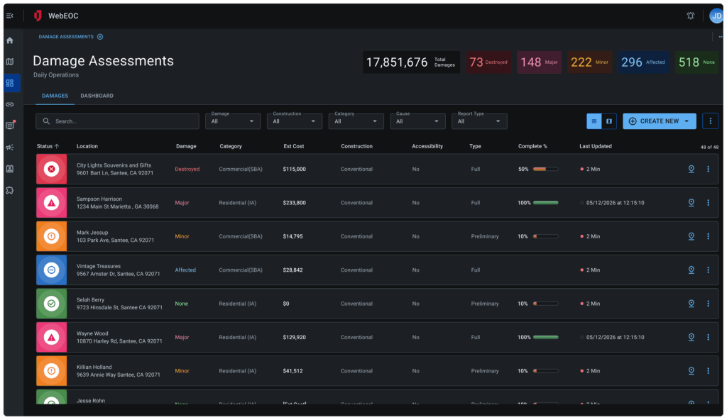 Track and document damage to property and infrastructure during and after incidents. Support federal reimbursement processes by maintaining detailed records of losses and impact assessments.