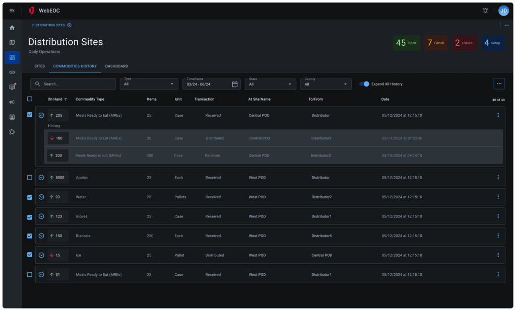 Manage points of distribution for supplies, resources, and services during emergency operations. Track locations, hours, inventory levels, and personnel to ensure efficient distribution operations.